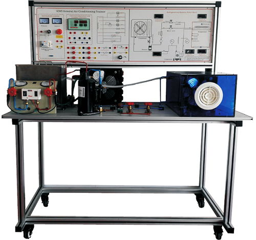 本裝置是采用直流式空氣處理系統(tǒng),并配置壓縮機、風(fēng)冷冷凝器、蒸發(fā)器、加濕器、電加熱器和風(fēng)管等真實部件,可測量壓力、溫度、濕度等過程參數(shù)。通過對本裝置的實驗,能使學(xué)生熟悉直流式系統(tǒng)的空氣處理過程,并得到熱工測量和計算的基本訓(xùn)練。本裝置適用于“制冷空調(diào)原理及應(yīng)用、制冷空調(diào)技術(shù)、建筑電氣控制技術(shù)等課程的實驗教學(xué)。