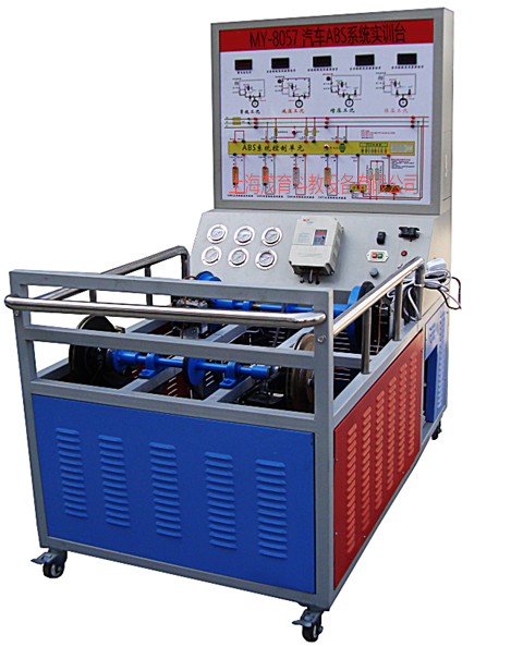 該設(shè)備由桑塔納2000ABS閥體總成、ABS控制單元、前碟后鼓制動機構(gòu)、輪速傳感器及信號盤;面板鐵柜、彩色原車電路原理圖、油壓原理圖、調(diào)速電機、變頻器及經(jīng)高溫噴塑處理帶滾輪臺架等組成。
