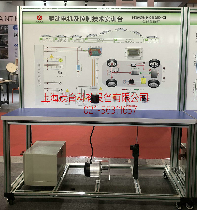 驅動電機及控制實驗臺,驅動電機及控制實驗裝置,驅動電機及控制實驗設備主要由新能源汽車電機(電機:永磁同步電機)、電機控制器、檔位開關、加速踏板、點火開關、電源及故障設置系統組成。